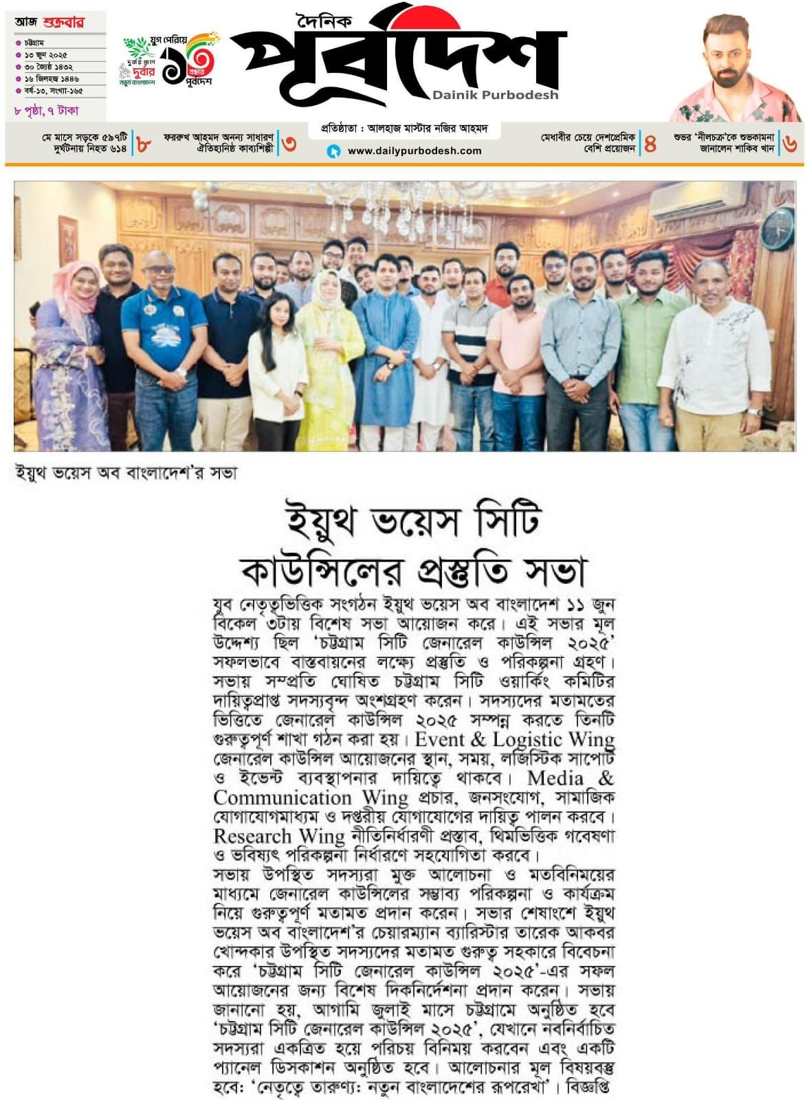 On 11 June 2025 at 3:00 PM, Youth Voice of Bangladesh (YVB), one of the country’s leading youth development organizations, organized a special meeting in Chittagong to prepare for the upcoming Chittagong City General Council 2025. The meeting was attended by the recently appointed members of the YVB Chittagong City Working Committee 2025, who actively participated in planning and discussions.