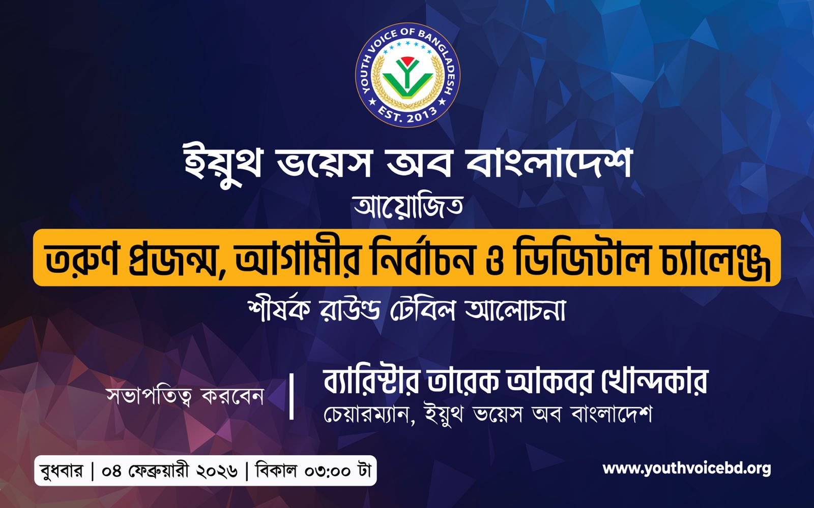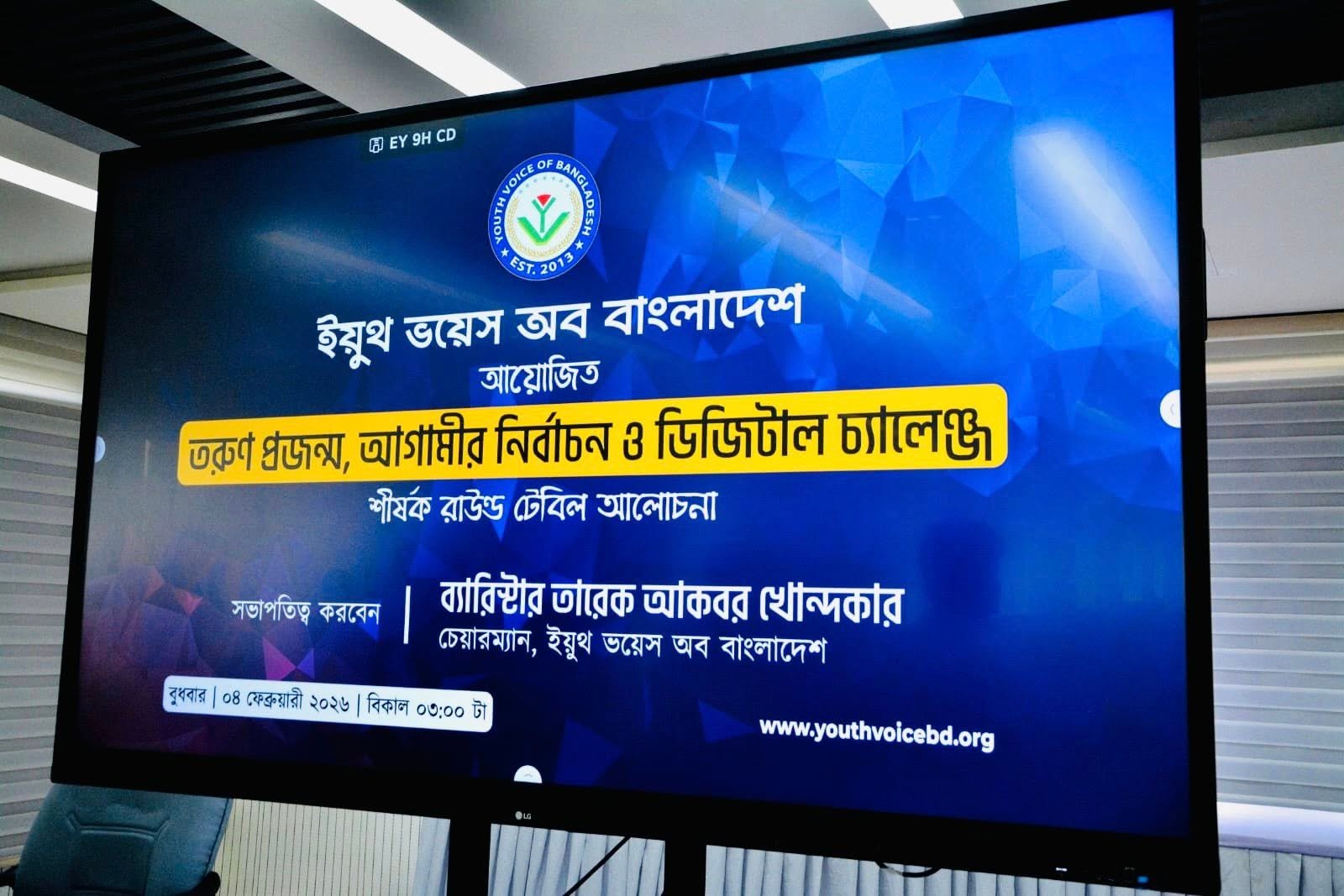 A significant roundtable discussion on youth political awareness, the upcoming national elections and the challenges of the digital era was held in Chattogram. Organized by Youth Voice of Bangladesh, the event took place on Wednesday, 4 February 2026, from 3:00 pm to 7:00 pm at the Zilla Parisad Auditorium, Chattogram.